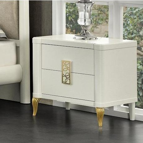 Прикроватная тумбочка на изогнутых резных ножках выполнена в стиле Ар деко. Оснащена двумя выдвижными ящиками, декорированными изящными кружевными золотыми ручками. Прикроватная тумбочка TRENTO отделка шпон дуба (oak veneer) в лаке цвета топленого молока (melted milk), сусальное золото (gold leaf)